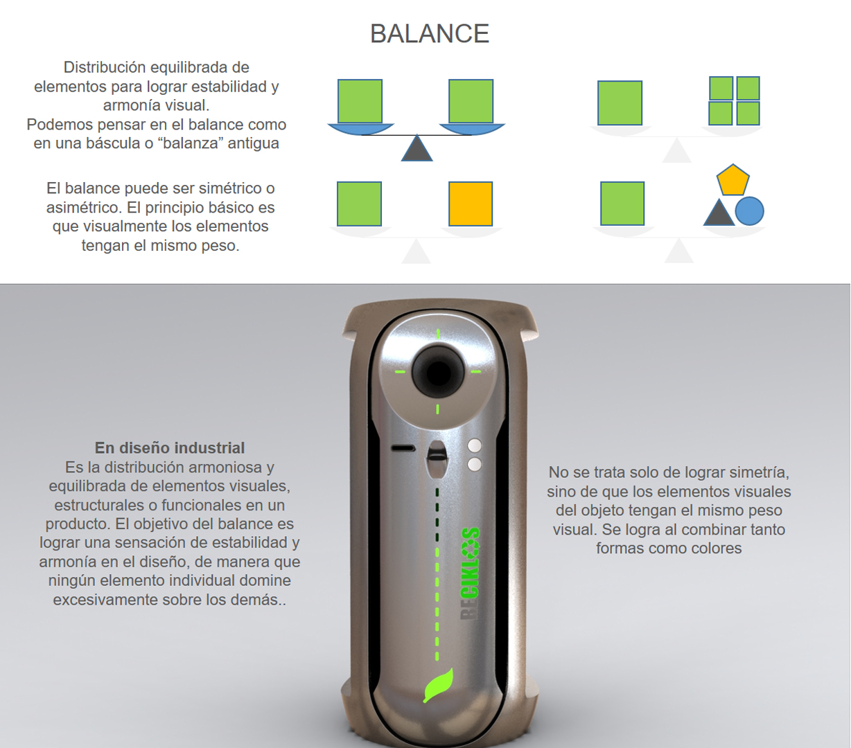 El concepto de balance en diseño industrial se refiere a la distribución armoniosa y equilibrada de elementos visuales, estructurales o funcionales en un producto. El objetivo del balance es lograr una sensación de estabilidad y armonía en el diseño, de manera que ningún elemento individual domine excesivamente sobre los demás.