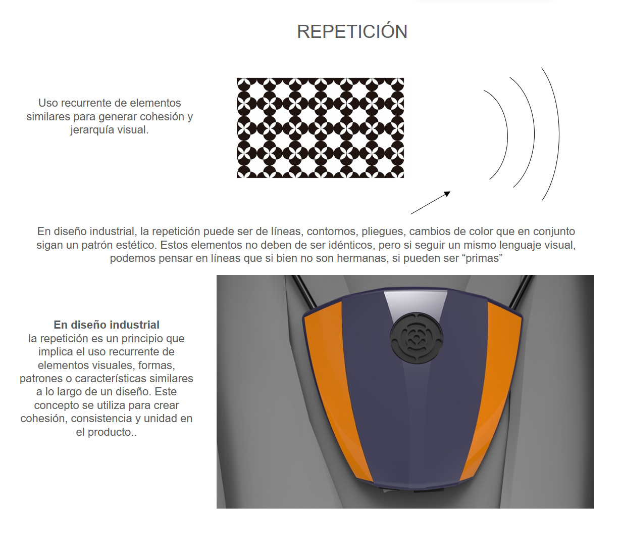 En diseño industrial, la repetición es un principio que implica el uso recurrente de elementos visuales, formas, patrones o características similares a lo largo de un diseño. Este concepto se utiliza para crear cohesión, consistencia y unidad en el producto.