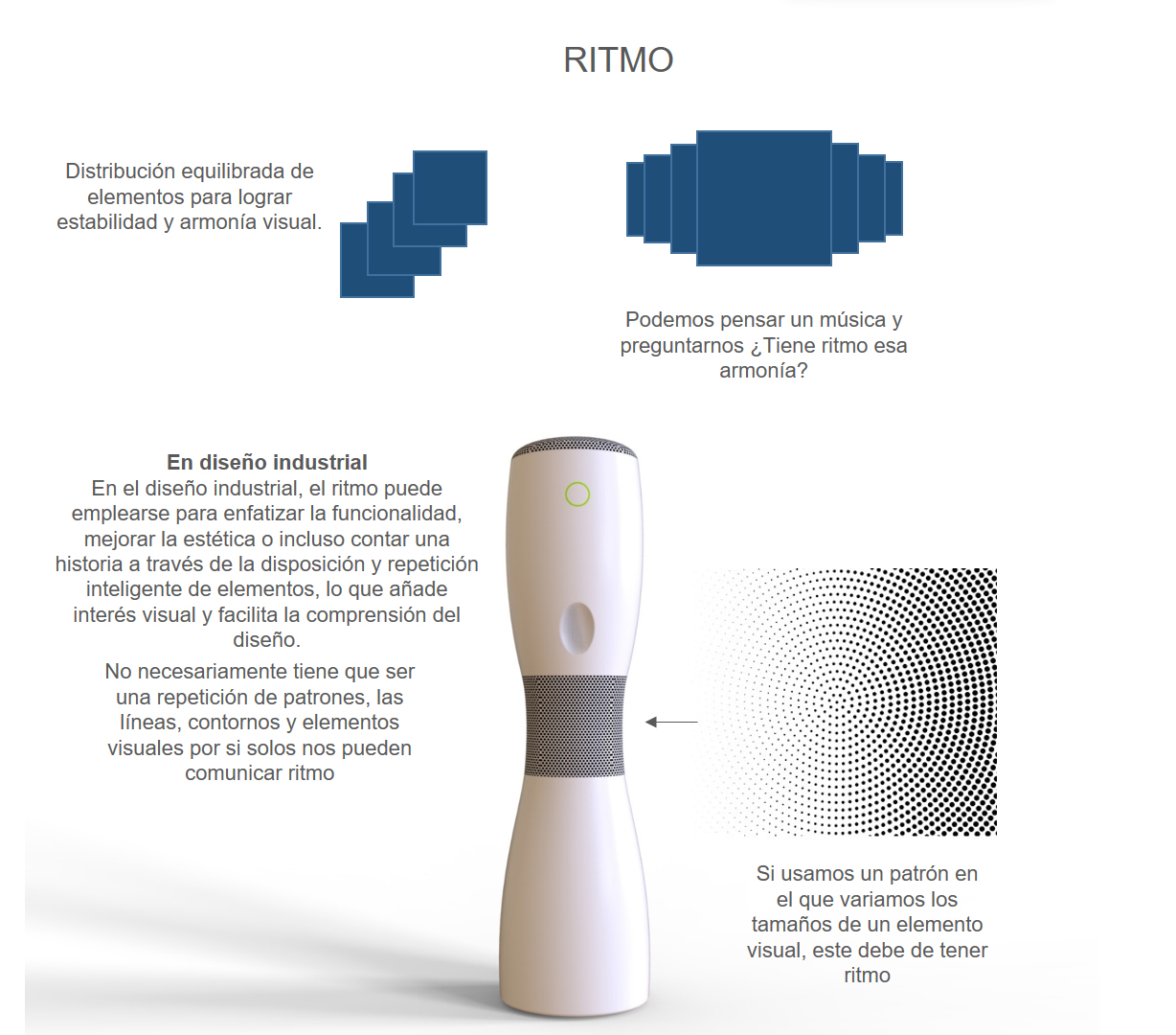 En el diseño industrial, el ritmo puede emplearse para enfatizar la funcionalidad, mejorar la estética o incluso contar una historia a través de la disposición y repetición inteligente de elementos, lo que añade interés visual y facilita la comprensión del diseño.